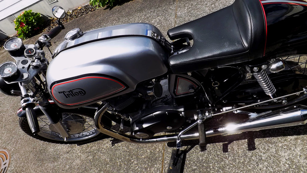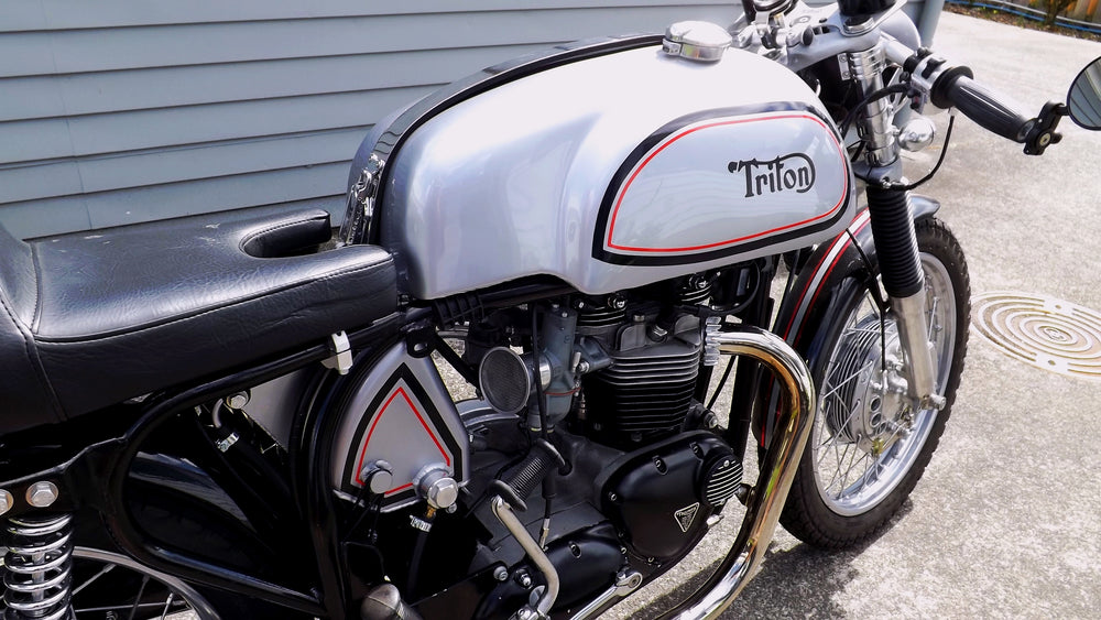 This is our first full Triton build. Our homage to the original Cafe Racers of the 60's. We took a 1967 Norton Atlas slimline frame and have powered it with a 1972 Triumph T120 engine to create our own version of the famous cafe racer. We started right back from a bare frame to complete a full build. Being a Triton, we were able to add our own twists and ideas into what suits our tastes while keeping the traditions at heart. For those of you worrying, we did not separate a matching frame/engine Atlas for the project (we would never dare!).