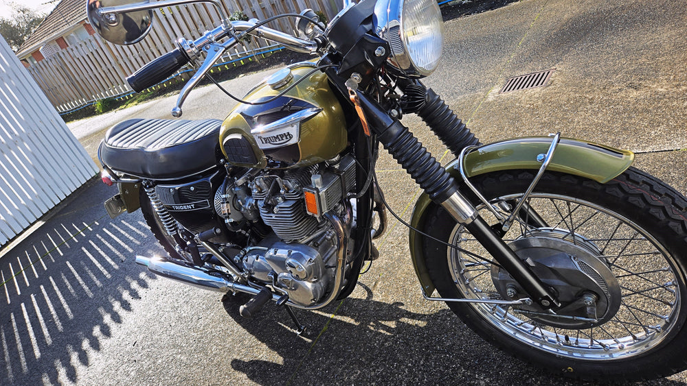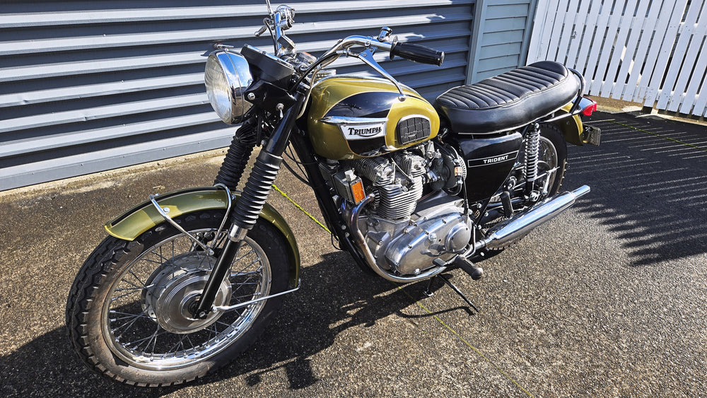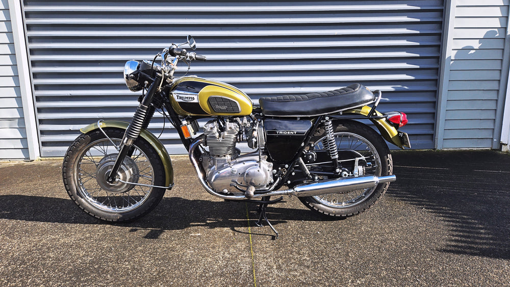 Imported a few years ago, this early T150T Trident comes with its original 'Beauty Kit' styling - a dealer-applied package introduced in 1970 to help reposition the model after slow initial sales. The kit replaced the factory Ogle-designed ‘breadbox’ tank and ray-gun silencers with more traditional Triumph items: a 650-style fuel tank, barrel-style mufflers, and a Bonneville grab rail. The result was a look that aligned more closely with Triumph’s twin-cylinder range and helped broaden the Trident’s appeal in the U.S. market.