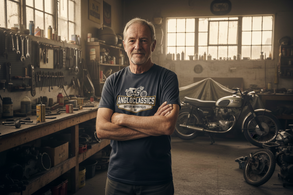 This is the official Angloclassics shirt - featuring our signature bike logo in crisp white and yellow on classic black. Clean, no-nonsense, and true to the brand, it’s perfect for wrenching in the shed, heading out on a ride, or just repping old-school British bike culture wherever you go.