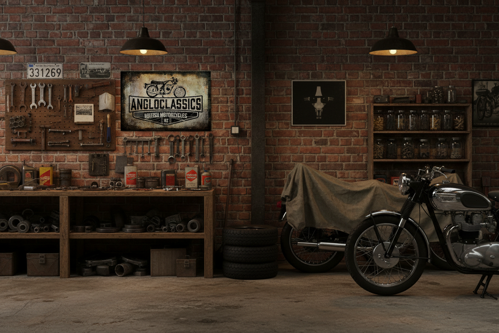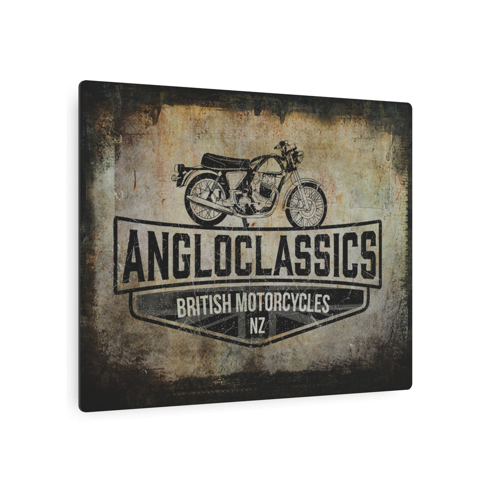 The Angloclassics logo anchors the design, framed by scuffed textures and muted tones that suit garages, workshops, and relaxed living spaces alike. Made from lightweight aluminium, it is easy to mount without sacrificing presence, while the matte finish reduces glare and lets the ageing and artwork do the talking.