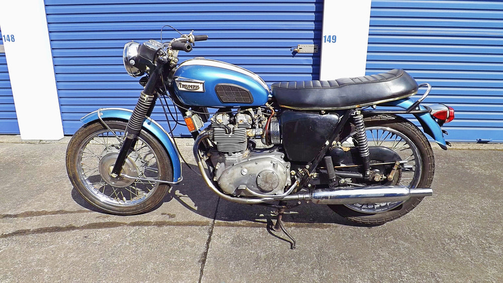 This matching numbers 1969 Triumph Trident T150 US Spec 'Beauty Kit' is a project bike. The bike has a bent crank caused by a failed primary chain. It came to us looking like the chain had caught and shattered the inner primary and in doing so caused the end of the crank to bend. Everything in the primary side has been replaced and the engine turns fine with good compression on 3 cylinders. All gears are there. The bend seems to be from the outside of the crankcase as it was only noticeable with the primary chain on and finding it tight and loose on rotation. Cases are fine. We believe the 9252 miles to be genuine and the bores still show hones marks.